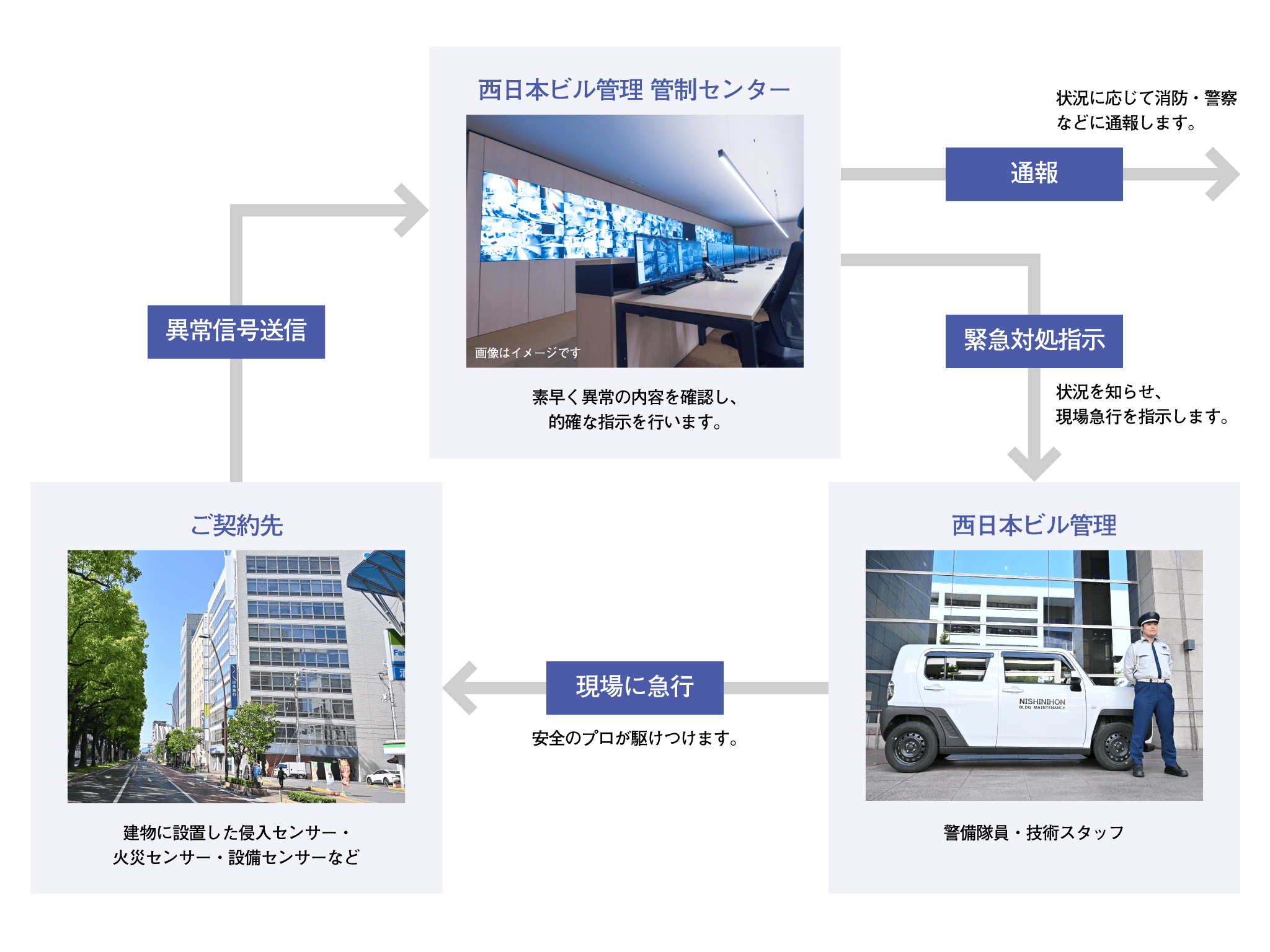 西日本ビル管理のオンライン機械警備システム。「24時間体制」「管理センター」「対処」の3つの要素がひとつになって大きな安心を生み出しています。